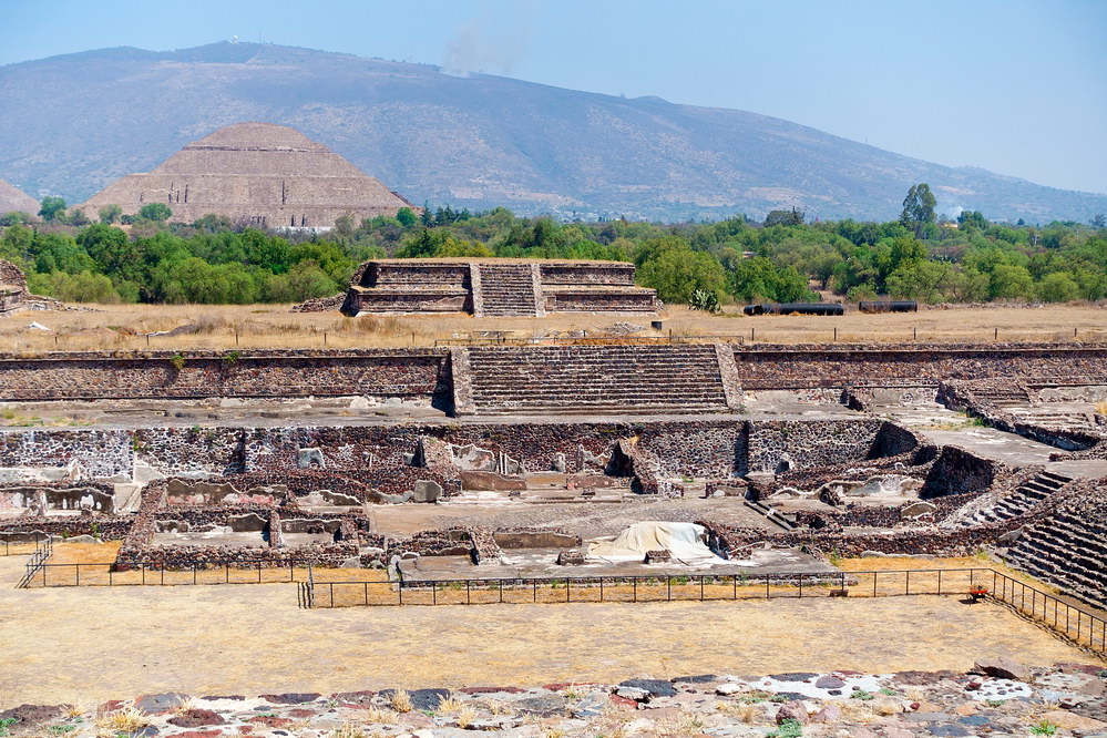 Das Gelände, auf dem die Sonnen und Mondpyramide stehen, ist riesig. Hier kann man viele Kilometer laufen, wenn man sie besichtigen möchte. Die großen Pyramiden konnten nicht mehr bestiegen werden. Es hat wohl zahlreiche Unfälle gegeben, so dass das Besteigen inzwischen untersagt ist. Allerdings sind noch kleinere Pyramiden da, und man muss bei dem Weg durch das Gelände sehr viele Stufen hoch und runter klettern. Diese Stufen sind sehr unregelmäßig und ziemlich hoch, das macht das Gehen ziemlich mühsam. Außerdem war es für uns, die wir aus dem Winter kamen, mit knapp 30° ziemlich heiß. Und das im März und obwohl Mexiko auf gut 2200 m Höhe liegt! Wir waren jedenfalls alle ziemlich geschafft als wir unsere Tour dort beendet hatte.