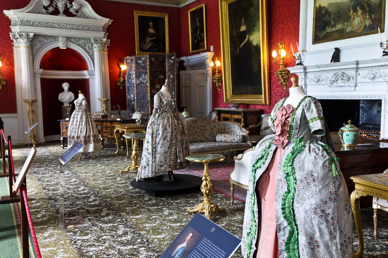 In einem der vielen herrschaftlichen Wohnzimmer. Man pflegte Bescheidenheit. Nein, das hier hat auch nichts mit der französischen Revolution zu tun, die arg unvollständigen Damen führen nur die bescheidene Alltagskleidung vor.