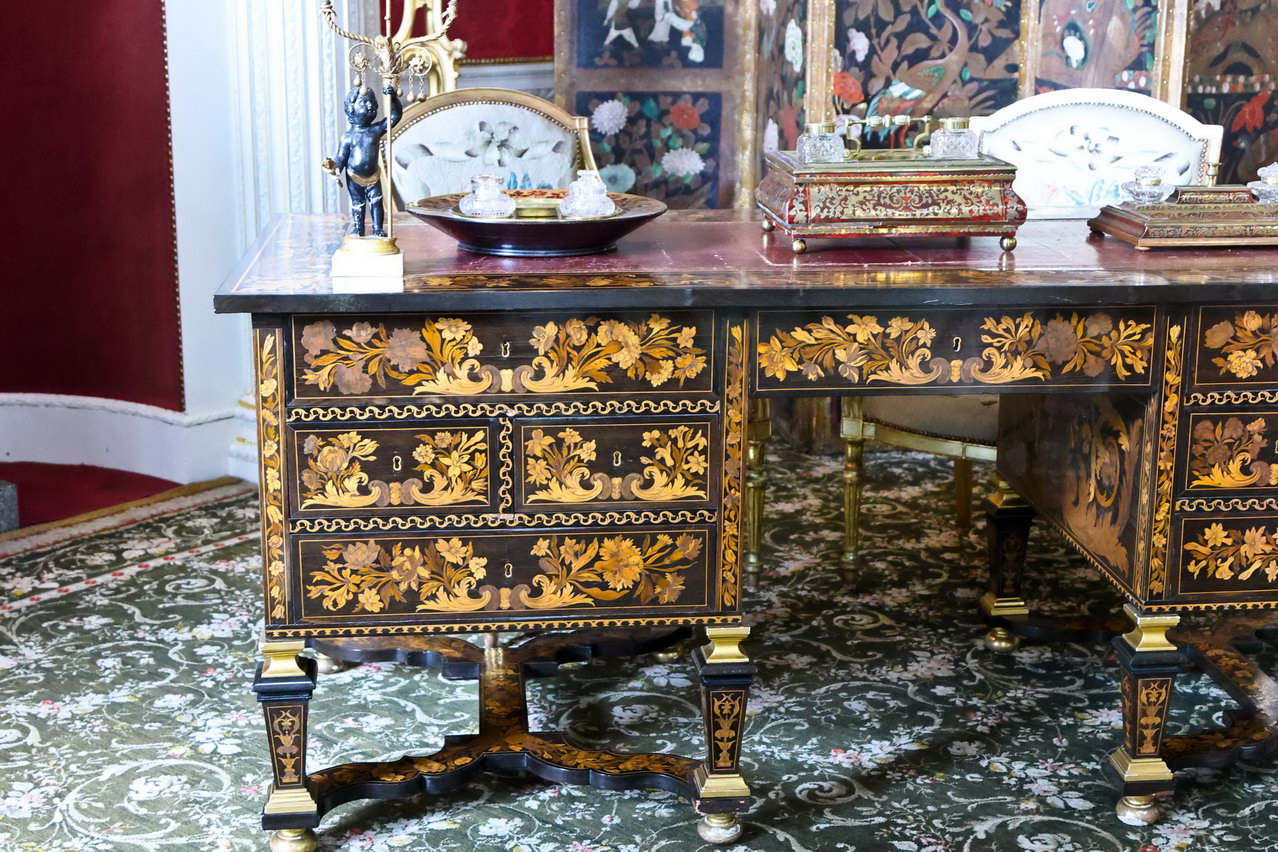Kaum vorstellbar, wie viel Arbeit es bedeutet, solch ein Möbel zu fertigen. Alle Einlegearbeiten wurden garantiert ohne maschinelles Werkzeug von Hand geschnitten und gefügt. Das kann schon fast eine Lebensaufgabe sein.