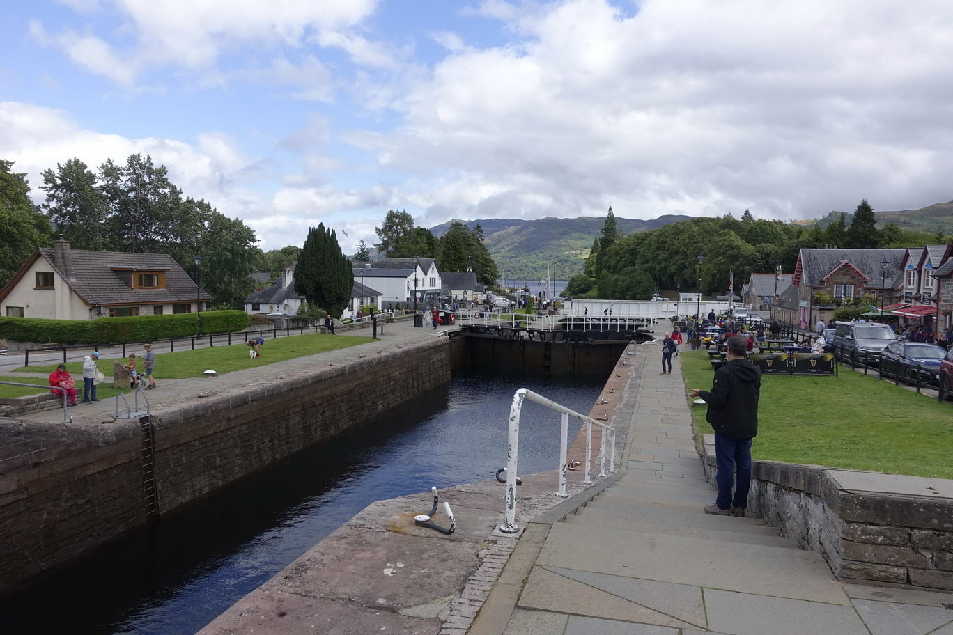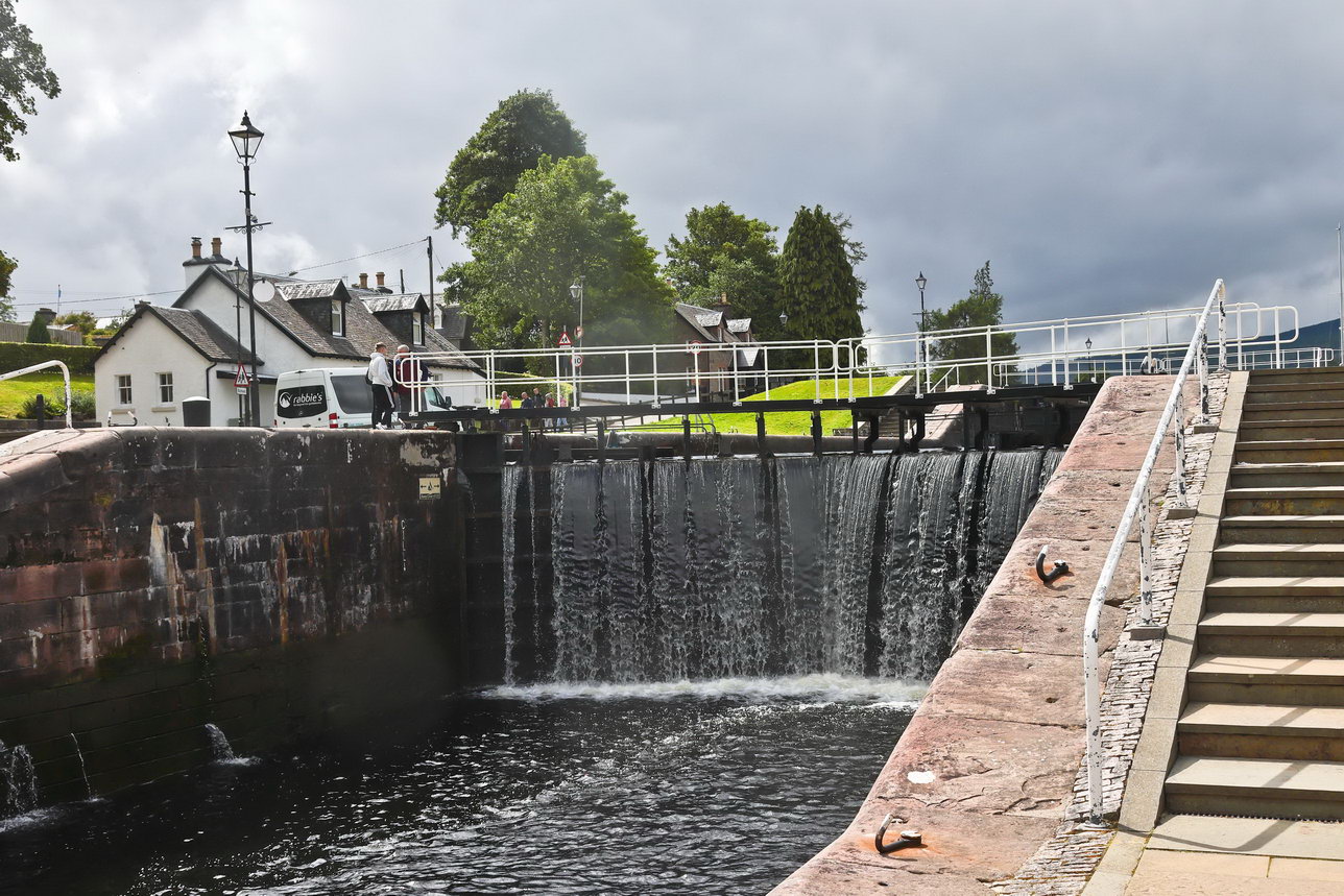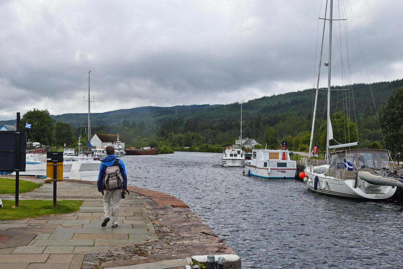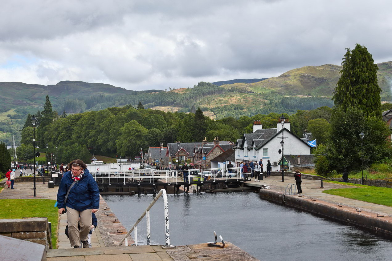 Wir erreichten den Caledoian Canal, der die Reihe aneinanderliegender Lochs so verbindet, dass ein Weg von Küste zu Küste entsteht dabei sind enorme Höhenunterschiede zu überwinden. Hier am Anfang des Kanals sind es mehrere schleusen, die hintereinander liegen und damit die erforderliche Höhe erreichen können