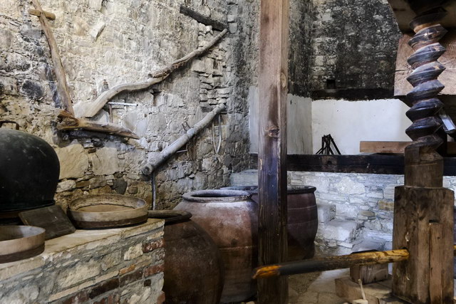 Olivenpresse und Vorratsgefäß.