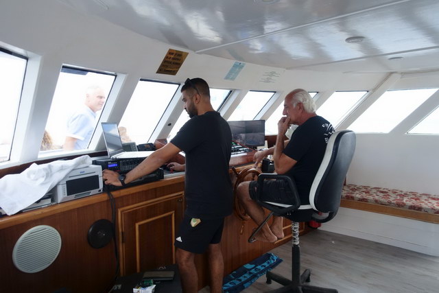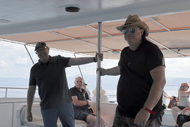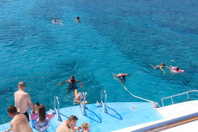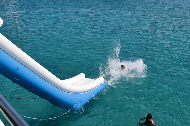 Etwas verspätet erreichten wir anschließend ein Boot. Mit dem wurde eine Tour zur „blauen Lagune" gemacht. Dort wurde der Anker geworfen und es konnte gebadet werden. Aufwand wurde nicht gescheut, sogar eine Rutsche ins Wasser wurde aufgeblasen. Nach etwa 1 Stunde ging es dann zurück. Solche Touren macht das Boot zweimal täglich.