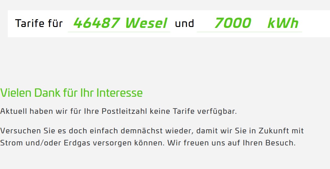 Die Preise am Markt entwickeln sich aktuell mit hoher Dynamik. Uns als regionalem Energieversorger ist es wichtig, Interessenten ein gutes und seriöses Angebot zu machen. Wir prüfen momentan die Tarifstruktur für unsere Strom- und Gasprodukte. Daher bieten wir zum jetzigen Zeitpunkt keine Tarife auf unserer Homepage an. Wir bitten um Ihr Verständnis für die derzeitige Situation.